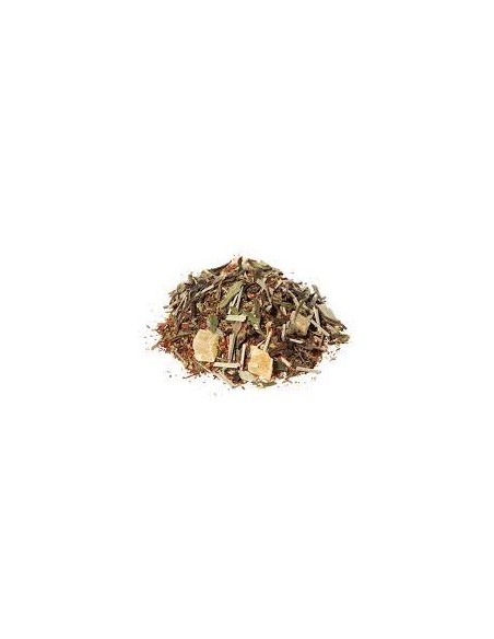 Composizione di rooibos, zenzero, arancia e cannella per una tisana speziata e calda.