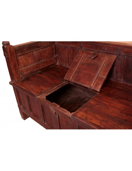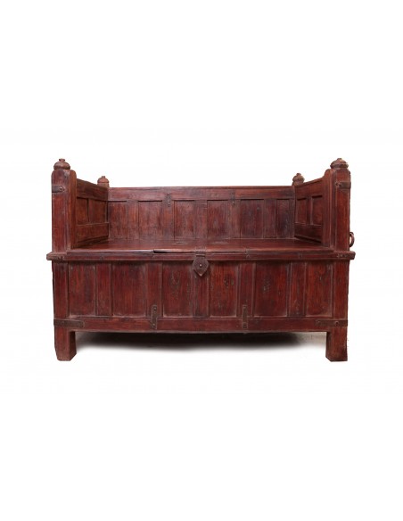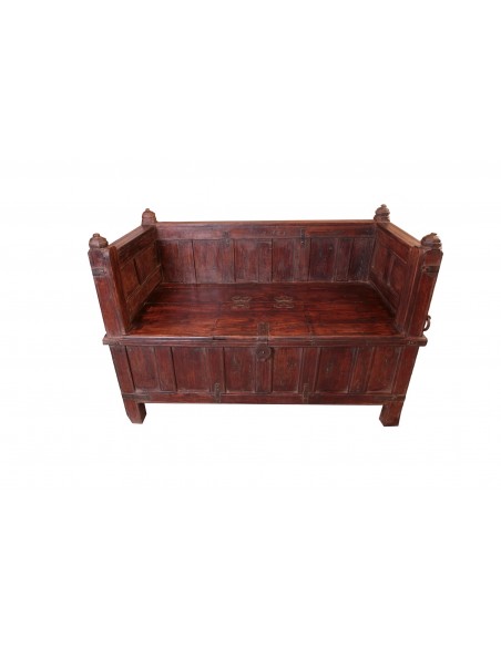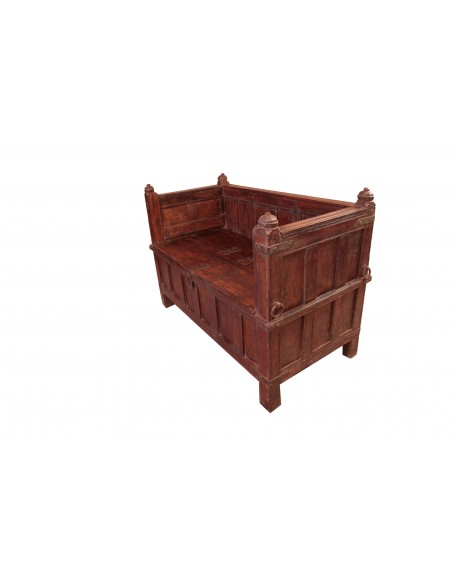 Ce magnifique banc ancien est l'expression de savoir-faire traditionnel et artisanal des ébénistes indiens. Celui-ci a été confectionné à partir d'un véritable coffre de mariage indien. Ce type de meuble a de tout temps accompagné les différentes étapes de la vie des familles. Composé de teck, il provient du Gujarat. Il dispose d'un grand espace de rangement, concède une bonne assise et est soigneusement sculpté. A la fois fonctionnel et décoratif, ce coffre-banc est une pièce unique qui saura embellir votre foyer sans commune mesure.