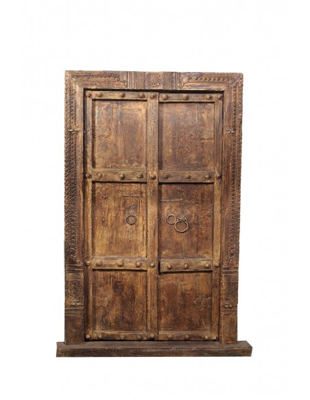 This original painted door is adorned with magnificent woodwork all around the doorway. Its rustic aesthetics testify to the great know-how of Indian cabinetmakers. This collector's item can be used both outdoors and indoors. Whether it is an opening for a room, a closet or a trompe-l'oeil, this unique piece will be the most beautiful effect. This door comes from Rajasthan and is made of different types of wood.