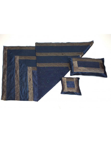 Dieses wunderschöne Set besteht aus einer Tagesdecke für ein Doppelbett und vier Kissenbezügen. Die Oberseite besteht aus Polyester und ist traumhaft schön mit Stickereien und goldenen Drucken verziert, die Unterseite ist aus Baumwolle gefertigt.