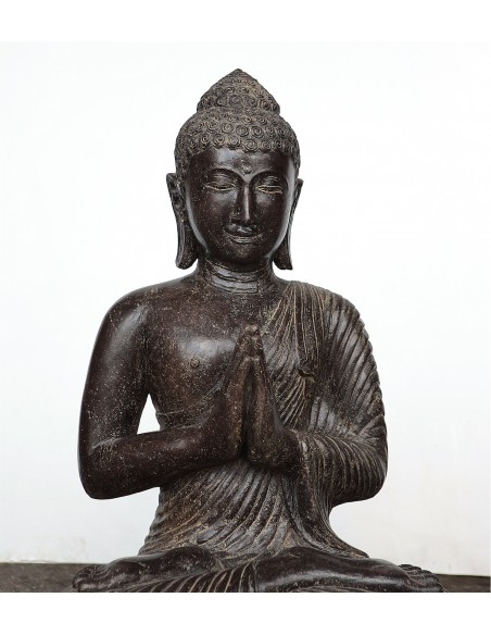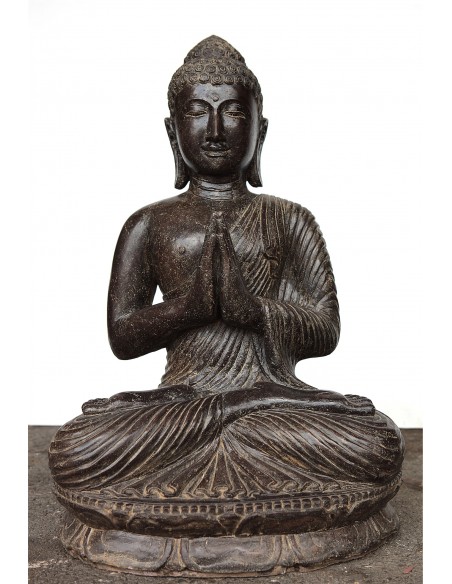 Succumb to the charm of our sublime representation of Buddha with the atmanjali mudra, the position of the hands in prayer. The gesture of joining hands in front of the chest strengthens the inner gathering and ensures harmony, balance, calm and peace. In India, it is also a gesture of greeting and gratitude. This statue is made from volcanic stones reconstituted by our craftsmen in Indonesia. Handcrafted in design, this statue of Buddha in full mediation will bring a zen and luminous atmosphere to your home.