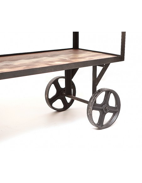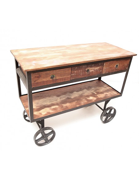 Vous êtes à la recherche d'un système de rangement simple et élégant pour votre cuisine ? Cette desserte LAKSHMAN répondra à vos besoins ! Cette table montée sur roulettes a été conçue par nos artisans en Inde et concède un style inimitable et résolument industrielle. Réel objet de décoration, cette desserte amovible est surtout fonctionnelle.Le métal, son plateau en bois recyclé et ses roues apportent un cachet certain. Par la qualité des matériaux employés et sa robustesse, ce mobilier industriel, également nommé mobilier factory, répond au besoin ambiant de s’éloigner d’une consommation de masse pour se rapprocher de valeurs plus pérennes. Cela en fait des meubles de qualité qui peuvent se garder pendant de nombreuses décennies.