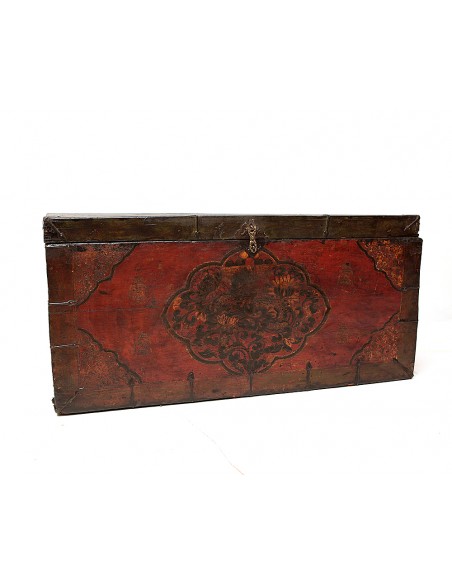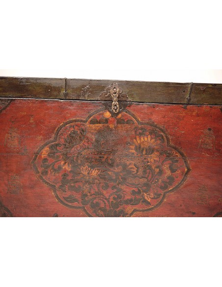 Ce grand coffre porte sur sa face antérieure un médaillon orné d’un décor tantrique centré d’un kapala Il est entouré de vases rituels sur fond de nuages tchi. Autour de ce médaillon, une frise de fleurs alternées d’entrelacs et de frises de grecques entoure un décor de fleurs dans un treillage.