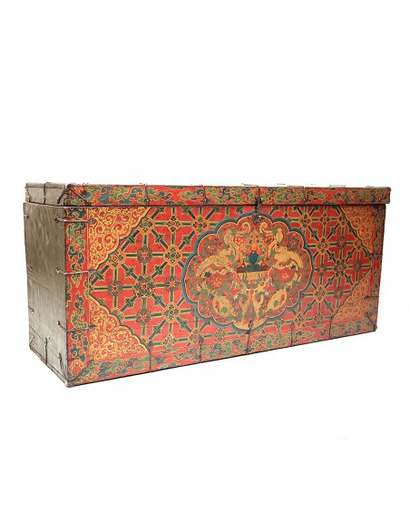 This large chest bears on its front side a medallion decorated with a tantric decoration centered on a kapala. It is surrounded by ritual vases against a background of tchi clouds. Around this medallion, a frieze of flowers alternated with interlacing and Greek friezes surrounds a decoration of flowers in a trellis.