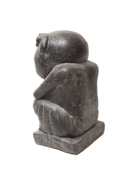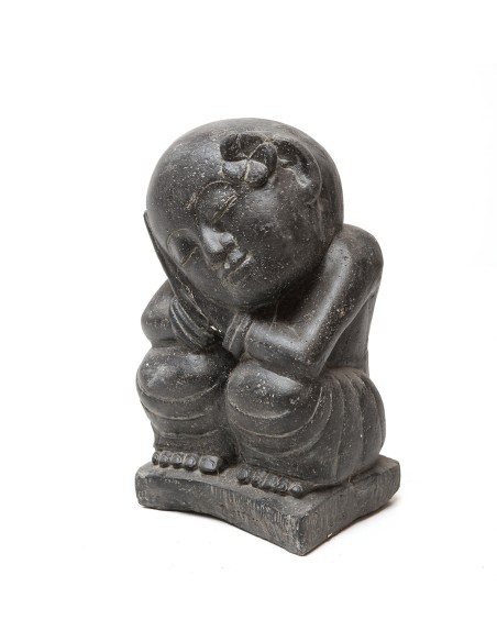 Diese von Hand geschliffene Statue aus rekonstruiertem Stein verleiht Ihrem Garten in Ihrer einzigartigen Ausführung eine ruhige Zen-Atmosphäre. Der buddhistische Mönch sitzt im Schneidersitz, hat eine Schüssel in der linken Hand und die rechte Hand an die Wange gelegt. Die Darstellung verkörpert ausgesprochene Gelassenheit und erfüllt Ihr Zuhause mit eben dieser Aura.