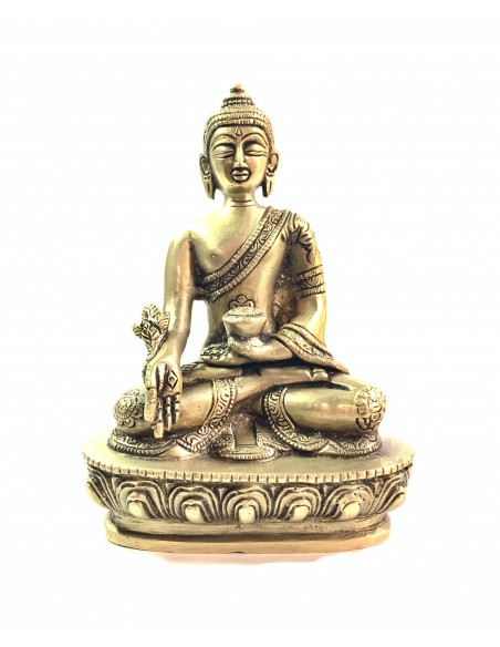 Ce Bouddha en bronze est une pièce somptueuse tant par son travail artisanal que par sa signification spirituelle. La main droite est ouverte et tombante, tourne vers le spectateur, le pouce et le majeur se touchent pour tenir une fleur. Ce geste caractrise le don, l'accueil, l'offrande. Sa main ouverte montre que rien n'est enfermé et que tout ce qui s'y trouve peut se répandre sur le monde. Son regard, n'exprime pas d'émotion, c'est le regard qui voit et qui sait tout. Entièrement fabriqué la main, vous noterez la finesse de ses traits qui lui offrent une prestance et une sérénité absolument magnifiques.