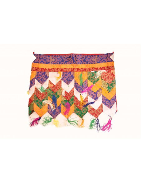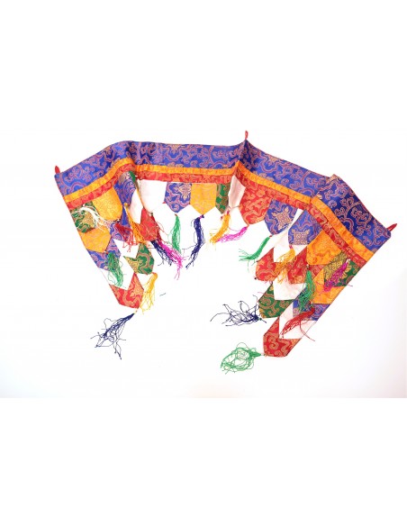 Les drapeaux de prières tibétains sont des guirlandes de petits rectangles de tissu imprimés de différents mantras. La plupart du temps ils sont de 5 différentes couleurs qui représentent les cinq éléments : Bleu pour l’espace, blanc pour l’air, rouge pour le feu, vert pour l’eau et jaune (parfois orange) pour la terre.