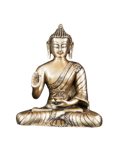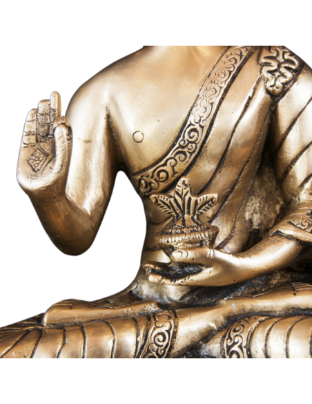 À la fois charismatique et élégant, cette petite statue de Buddha assis en tailleur symbolise connaissance, sagesse, bienveillance et compassion. Finement travaillée à la main, tout est en détail. Ce Bouddha avec le mudra Vitarka a la main droite est levée, le pouce et l'index se joignent et forment un cercle. Ce cercle symbolise la roue, l'enseignement. Très bel élément de décoration, il viendra égayer votre espace de vie sans commune mesure.