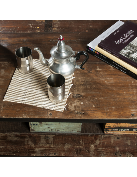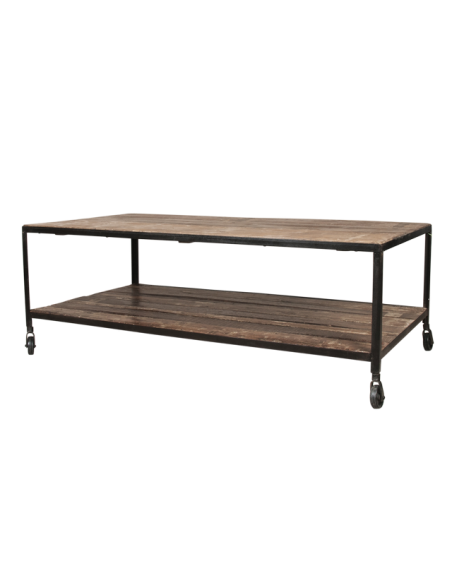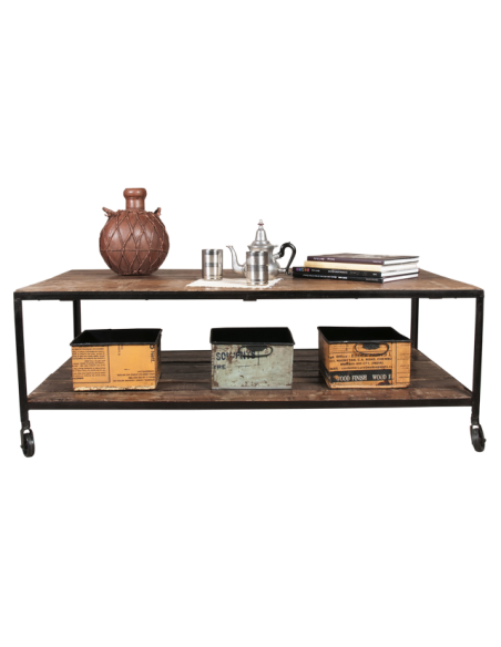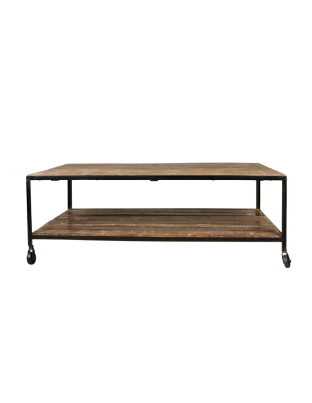 La table basse CHEMIN DE FER est réalisée avec le bois des chemins de fer indiens. Fruit d’un travail artisanal, la beauté de cette pièce réside dans le mélange du bois et de l’armature métallique. Son grand plateau et son tablar offrent un bel espace de pose. Élément central de votre salon, elle est idéale pour réunir des amis et proches. Montée sur roulettes, cette table basse est également fonctionnelle.