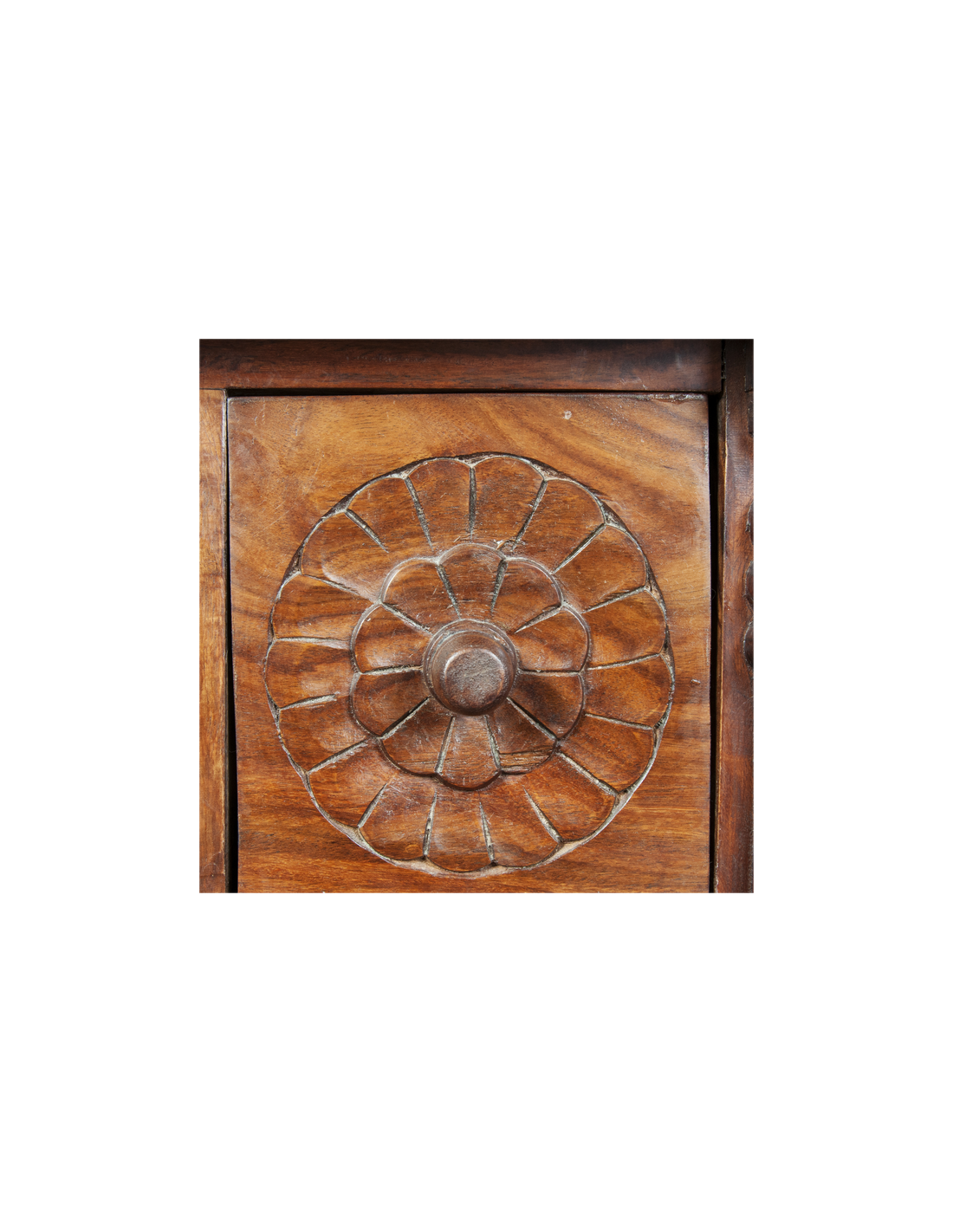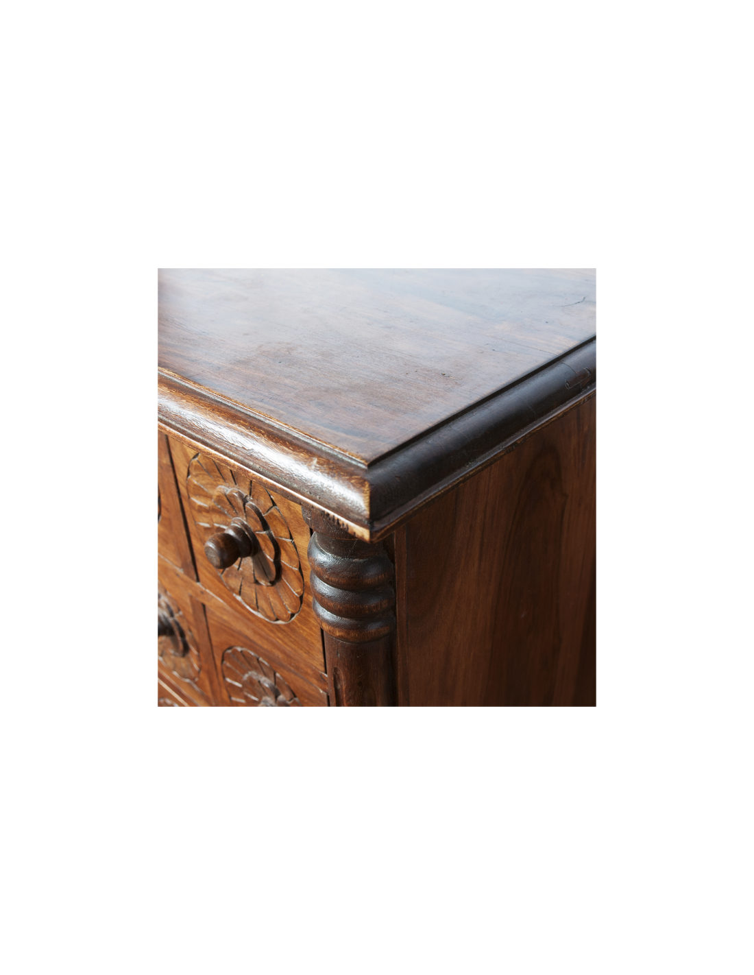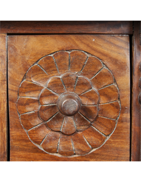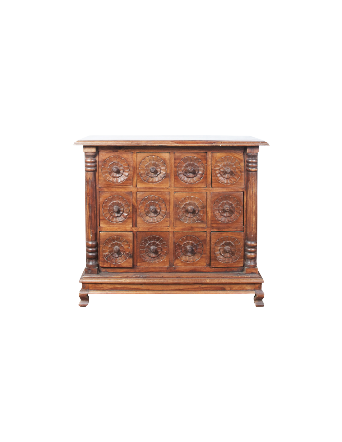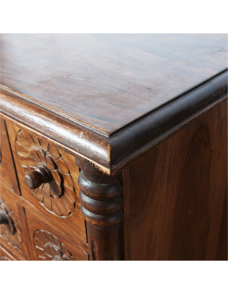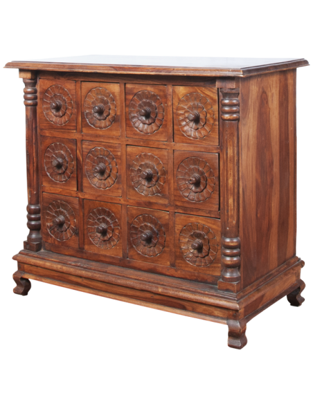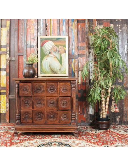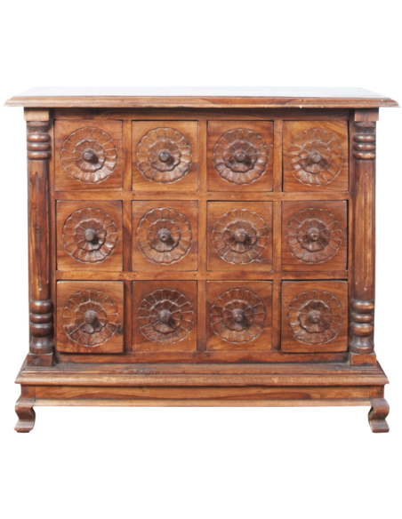 La sublime commode VEDA est un meuble de médecine ayurvédique indienne. L'ayurveda ou encore médecine ayurvdédique puise ses sources dans les Véda, ensemble de textes sacrés de l'Inde antique. Réalisée entièrement à la main par des artisans qualifiés, les finitions et les motifs sculptés de cette commode sont absolument sensationnels. Ses douze tiroirs offrent un bel espace de rangement et son large plateau accueillera volontiers un grand miroir ou un luminaire. Idéale pour amener une atmosphère spirituelle à une chambre, cette commode pourra également être placée dans une entrée pour accueillir vos visiteurs de manière positive.