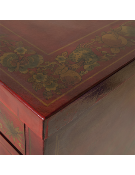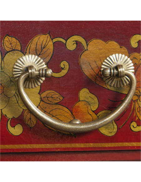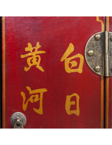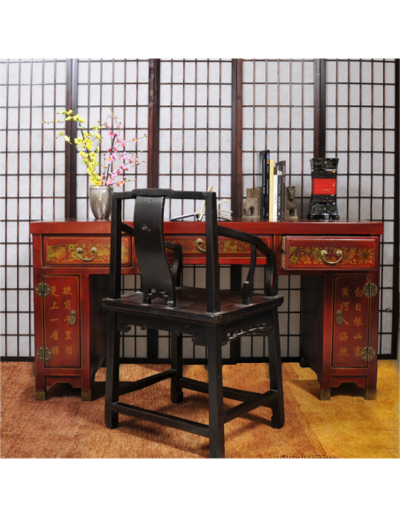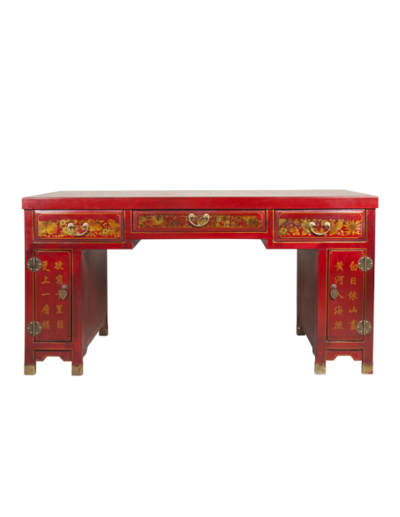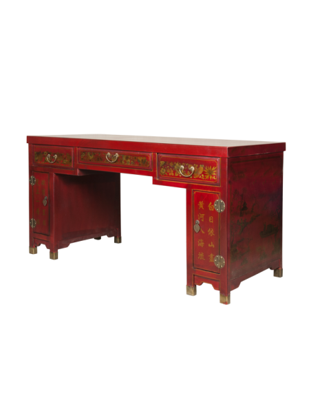 Le bureau CHUN sera un allier stable et spacieux dans votre travail. Munis de trois tiroirs et de deux petits espaces de rangements, ce bureau concède une utilisation particulièrement fonctionnelle. Son plateau est suffisamment large pour y disposer ordinateur et livres. Très résistant et solide, ce joli meuble apportera également une atmosphère accueillante et chaleureuse dans votre pièce de vie grâce à sa couleur rouge chatoyante, ses motifs décoratifs et ses finitions au niveau des poignées, des pieds et des gonds apparents.