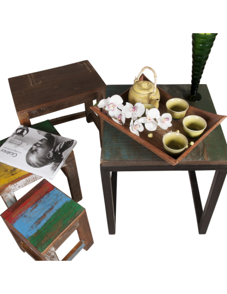 Les tables gigognes sont particulièrement pratiques et peuvent s’utiliser ensemble ou séparées. S’imbriquant les unes dans les autres, elles vous offrent un gain d’espace ou une surface de pose selon les envies. Ses couleurs uniques dues à l’utilisation de différents types de bois et son design épuré sauront trouver leur place dans votre intérieur et apporter un côté moderne et contemporain à l’ensemble.