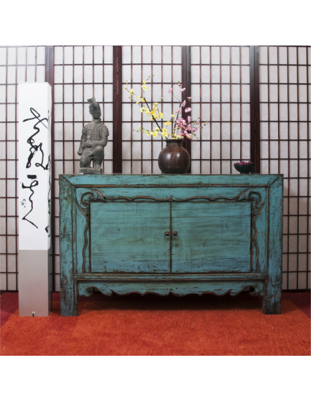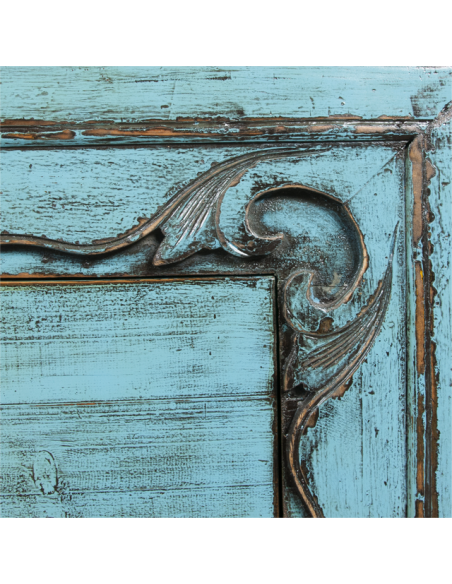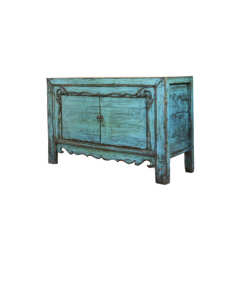 La desserte AIGUO bleue a un design très brut et est rehaussée par les détails sculptés sur la devanture. Entièrement peinte à la main, la technique utilisée lui apporte un côté vieilli très tendance. Ses deux portes offrent un bel espace de rangement dans lequel vous avez la possibilité d’ajouter un tablar central afin d’accroître sa fonctionnalité. Idéale dans un salon, elle s’intégrera également très facilement dans une chambre ou un couloir. Disponible en bleu, vert et gris et avec des motifs peints sous la référence MER00489.
