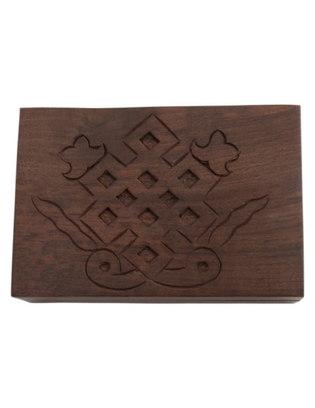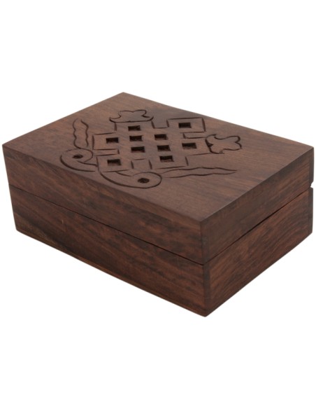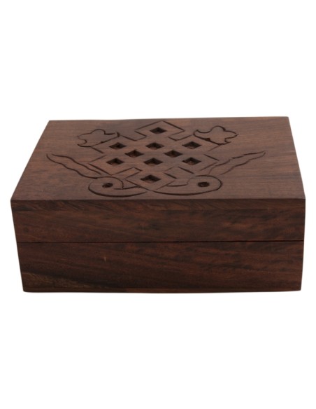 Joliment travaillée, cette boite en sheesham reprend le symbole tibétain du noeud infini. Symbole d'amour, ce noeud nous rappelle que tous les phénomènes sont connectés les uns aux autres et apporte le bon augure. Elle protègera vos objets les plus précieux et vous rappellera la sagesse infinie du Buddha. Idale sur une desserte dans une entrée, cette boite trouvera également aisément sa place sur une commode dans une chambre.