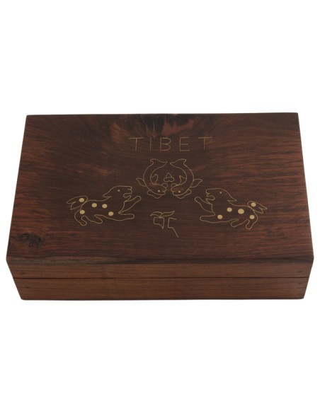 Cette boite TIBET regorge de symboles de cette contre lointaine. Vous remarquerez les lions des neiges finement incrusts en fils de cuivre qui sont le symbole national du Tibet, le couple de poissons reprsente la libration de lÕesprit du cycle Samsara (cycle des rincarnations) et le signe central est un aum symbole reprsentant le son de la cration originelle. Pleine de symboliques et riche en mottions, cette boite saura garder vos biens les plus prcieux. Son design sobre en fait un objet idal pour dcorer une desserte ou une commode.