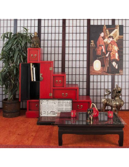 The KAIFENG double-sided staircase cabinet will delight lovers of Asian furniture. It indeed displays Chinese lines in the design and finishes. With six drawers and two doors, it offers a nice and very practical storage space. All the elements pass through, which makes it possible to place the piece of furniture in one direction, in the other or to use it as a room divider. Ideal in an entryway or living room, this piece of furniture could just as easily fit into a bedroom.