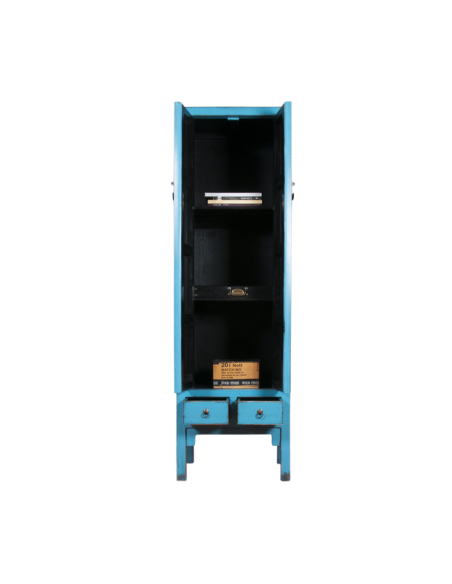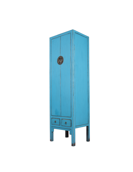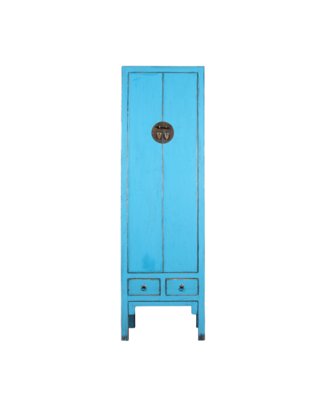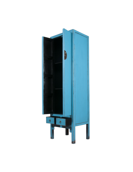 Stretto e alto, l'armadio ZHAI è sia funzionale che decorativo. I suoi colori vivaci porteranno molta allegria al tuo interno. Con due cassetti e tre ripiani, offre lo spazio perfetto per riporre i tuoi vestiti e possiamo anche pensare di aggiungere una parte guardaroba in alto o in basso. La piccola larghezza di questo mobile permette di collocarlo in spazi ridotti senza sovraccaricare la tua stanza. Ideale in una camera da letto, questo armadio può inserirsi anche in un ingresso dove accoglierà calorosamente i vostri ospiti. La lacca e gli accessori in bronzo concedono un certo estetismo. Questo mobile è disponibile in blu, arancione e rosso.