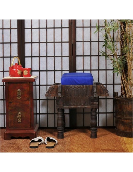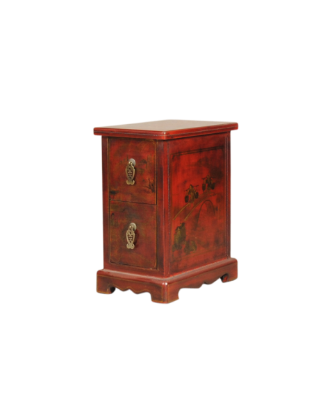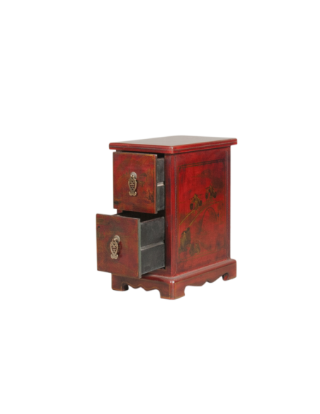 The nightstand is a must have, balancing the useful with the pleasant. The SHENG bedside table conveys an inimitable style with its handles worked in the shape of a fish and the scenes of Chinese life painted by hand. The topstitching on the sides and the top enhance the quality of the work. Looking at this piece of furniture, we immerse ourselves directly in the China of yesteryear. Perfect in a bedroom on either side of the bed, this small cabinet is also the perfect size for storing CDs. In order to best protect the top of your furniture, we recommend that you place a protective glass on it.