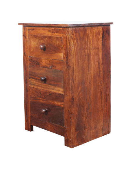 Classique et distinguée, la commode en bois massif VISRAMA offre de jolies finitions. Toute la beauté du véinage du sheesham ressort pour apporter de l’authenticité à l’ensemble. Les trois tiroirs finis avec des boutons de poignée en bois se fondent dans l’ensemble tout en apportant un bel espace de rangement. Le dessus de la commode concède quant à lui un beau plateau qui saura sublimer un luminaire ou de la décoration. Idéale comme meuble d’entrée, cette commode pourra également être utilisée en table de chevet haute ou dans une chambre pour ranger petit linge et jouets d’enfants.