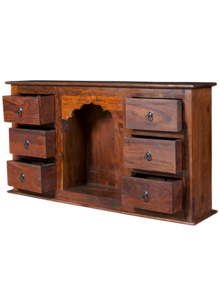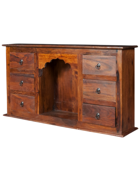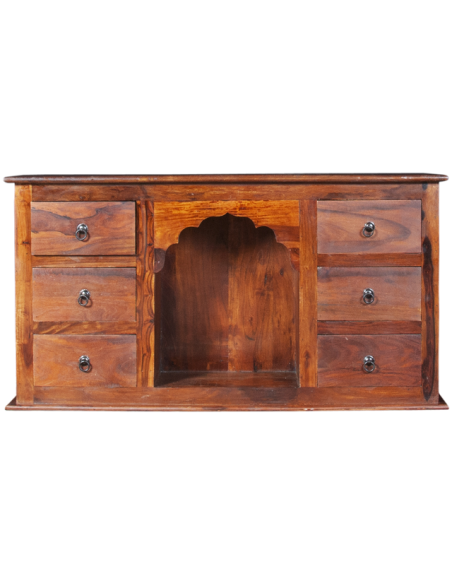 Bring an exotic touch to your interior with the MAHALA solid wood dresser. The central niche makes us travel and takes us straight to the land of Maharajahs, it is the ideal place to deposit a statue or a frame. The véinages of the wood stand out beautifully on this piece and the six drawers provide significant storage space. Placed on the floor, on a large desk or suspended on a wall, this small sideboard is a timeless piece that will perfectly dress a living room or a dining room.