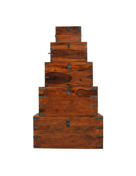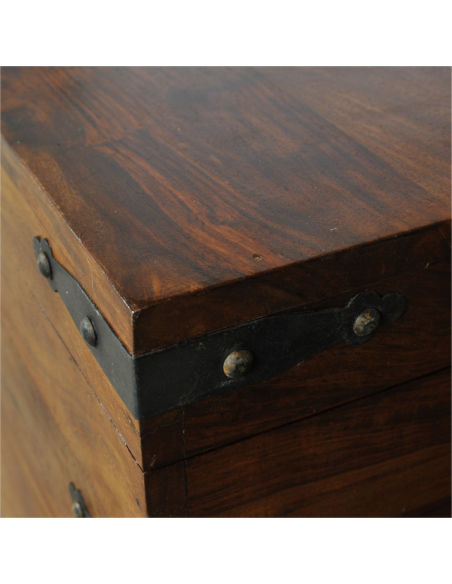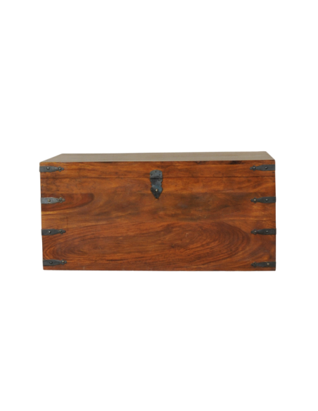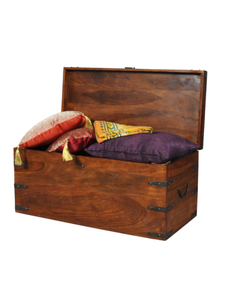Servant à la fois de banc, de coffre et de bagage, ce meuble est utilisé depuis des siècles à travers les différentes civilisations pour le stockage et le transport de diverses marchandises. Réalisée entièrement en bois massif, le coffre PUNJAKA fait ressortir le véinage exceptionnel du sheesham. La finesse des finitions en fer forgé sur les angles confère ayant à elle beaucoup de charme. L’attache centrale permet de le sceller avec un cadenas en cas de besoin et les poignées latérales offrent une facilité de transport. Bout de lit, bar ou siège d’appoint selon les dimensions, ce mobilier offre de nombreuses fonctionnalités et son style sobre lui permettra de s’intégrer facilement dans votre intérieur.