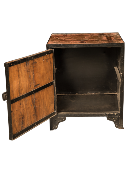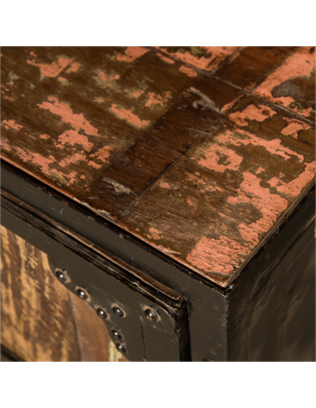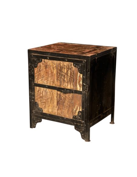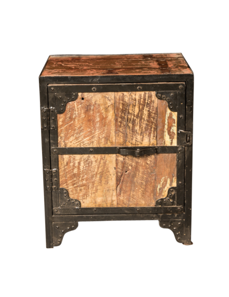 La table de chevet "Ganga" tire son côté unique de sa fabrication artisanale. Elle est parfaite pour apporter un cachet authentique à votre chambre à coucher. Son aspect brut ainsi que sa finition métallique lui apportent un côté industriel qui s'accorde très bien dans un esprit loft ou un intérieur plus classique. Très fonctionnelle, l'utilisation du bois recyclé nous permet de vous proposer des meubles aux variations de couleurs uniques qui sauront s'adapter à vos goûts et à votre intérieur.